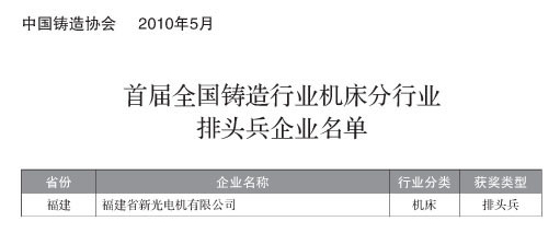 全國鑄造行業綜合百強企業100家;全國鑄造分行業排頭兵企業:鑄造生產企業100家;鑄造原輔材料生產企業10家;鑄造裝備企業12家; 全國鑄造行業“專、特、精、新”優勢中小企業46家;總計268家企業入選。